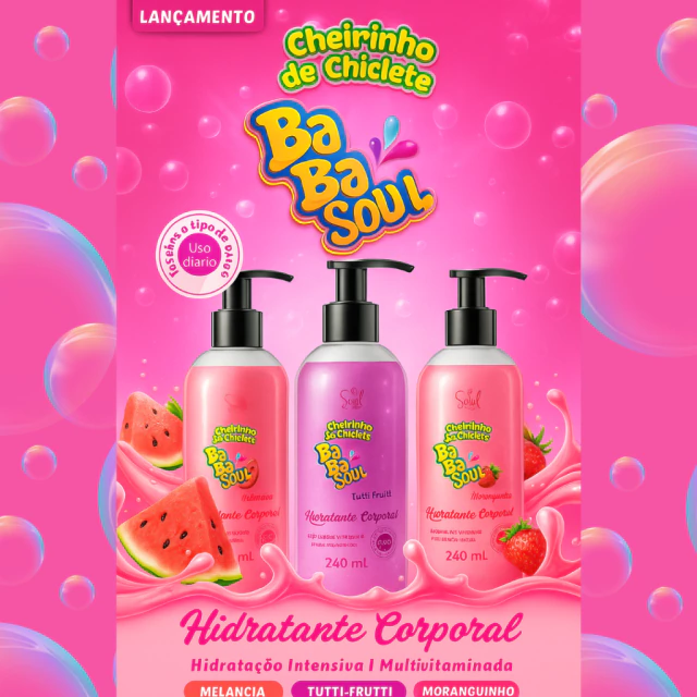O Kit de Hidratantes Babasoul Soul traz três fragrâncias incríveis – Chiclete Tutti-Frutti, Melancia e Morango – para cuidar da sua pele de forma divertida e sensual. Textura cremosa, rápida absorção e um perfume que dura por horas. Ideal para quem quer pele hidratada e perfumada o dia inteiro.